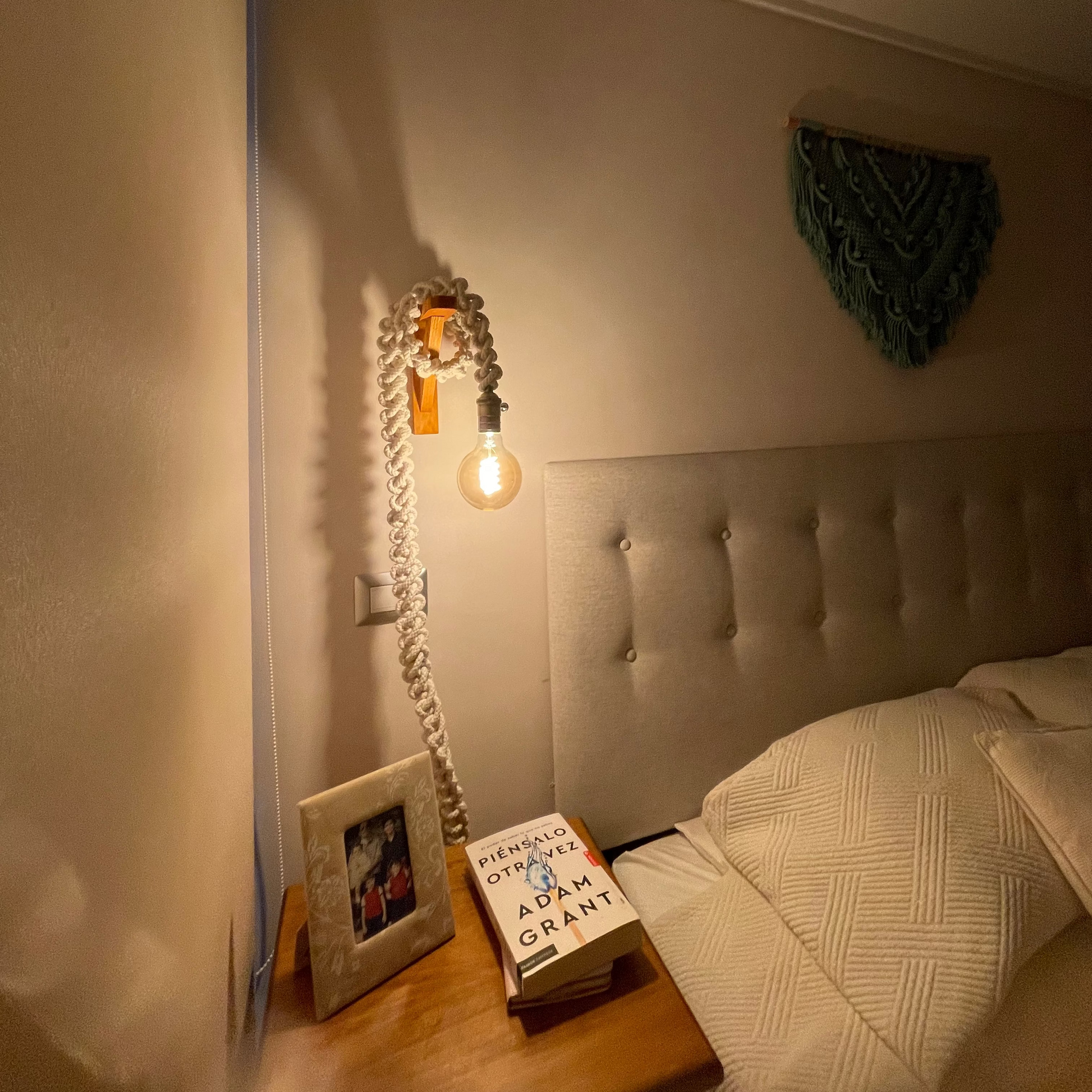 ✨Características: ✔ Macramé tejido a mano con materiales de alta calidad ✔ Largo del cable 2 metros aproximadamente ✔ Soporte madera: 20 x 25 cms ✔ Bombilla vintage de filamento cálido ✔ Base de bombilla en tono bronce ✔ Opción con o sin soporte de madera barnizada