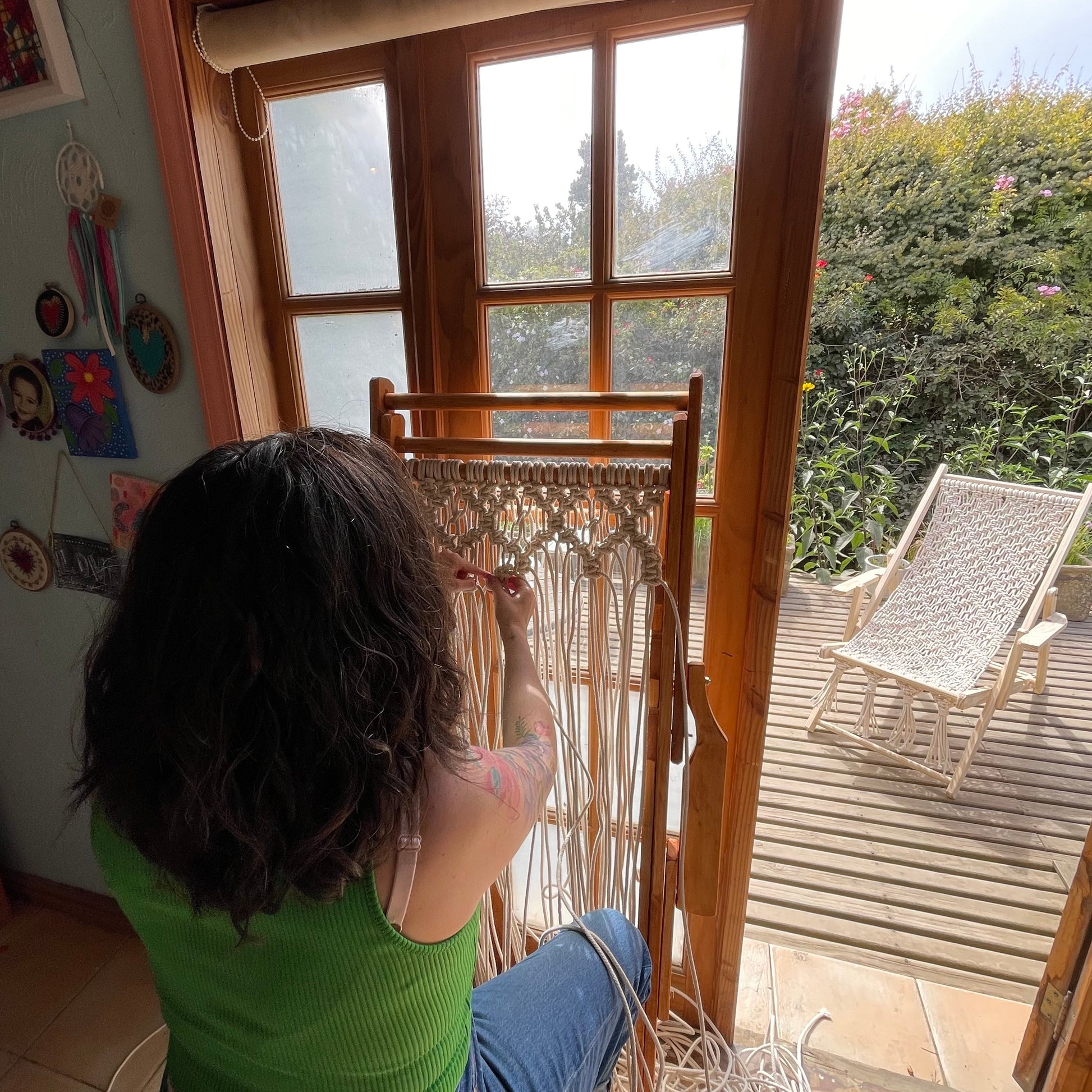 ✨ Incluye todo lo que necesitas: ✔️ Curso online completo para que aprendas paso a paso a tejer la reposera en macramé. ✔️ Estructura de silla playera en pino natural, lista para usar. ✔️ Cordones de algodón natural cortados y montados, listos para que solo te enfoques en tejer.